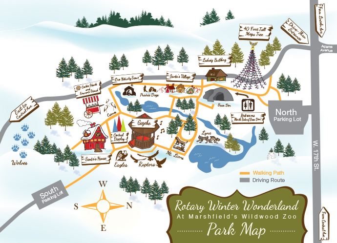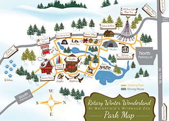 Illustrated map for the Rotary Winter Wonderland brochure at Marshfield's Wildwood Zoo.Participation :: Concept, Design, Illustration